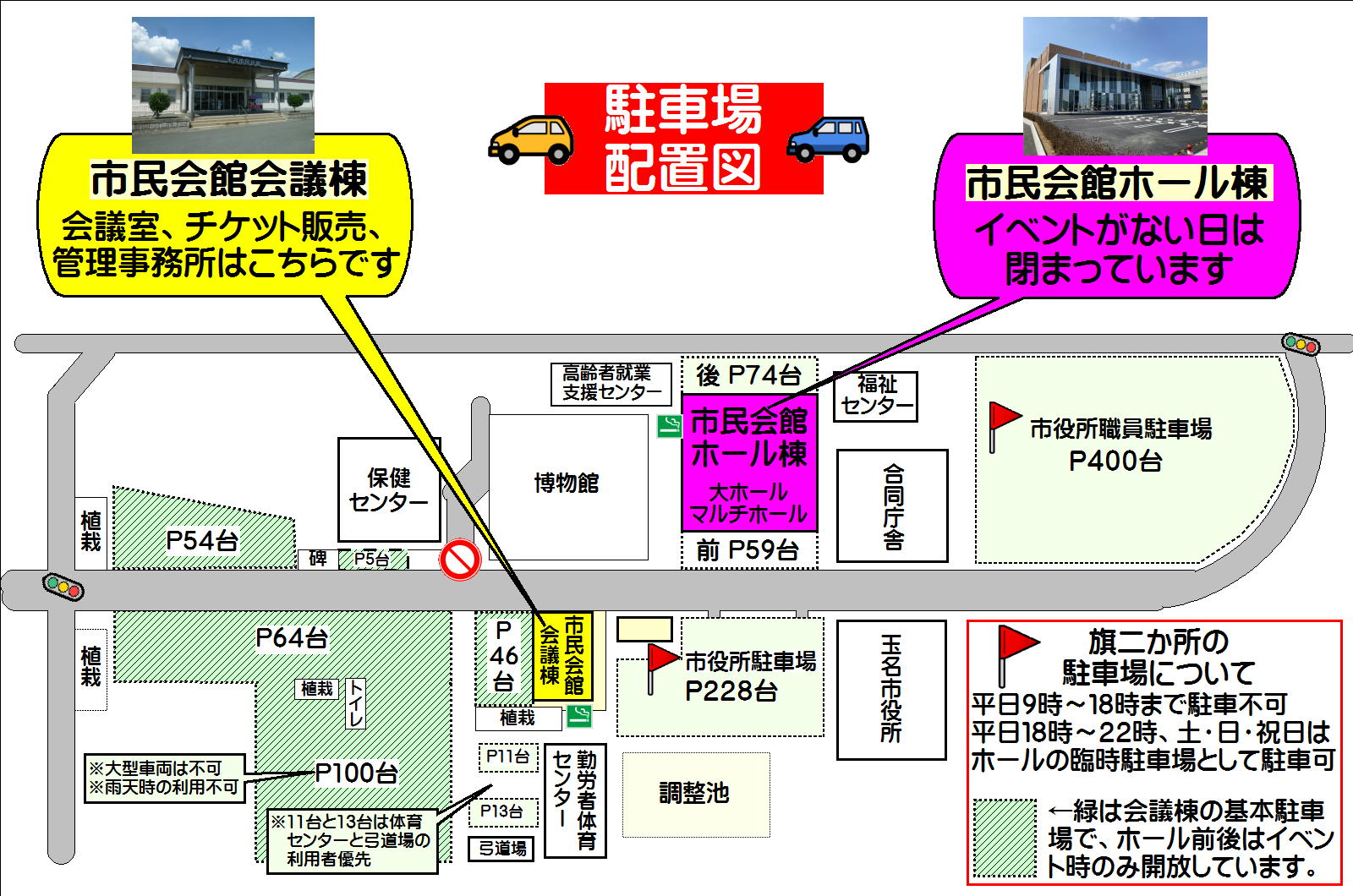 ※4施設(市民会館ホール、会議棟、体育センター、弓道場)共有の駐車場のため、なるべくお乗り合わせ、または公共交通機関をご利用の上ご来館ください。