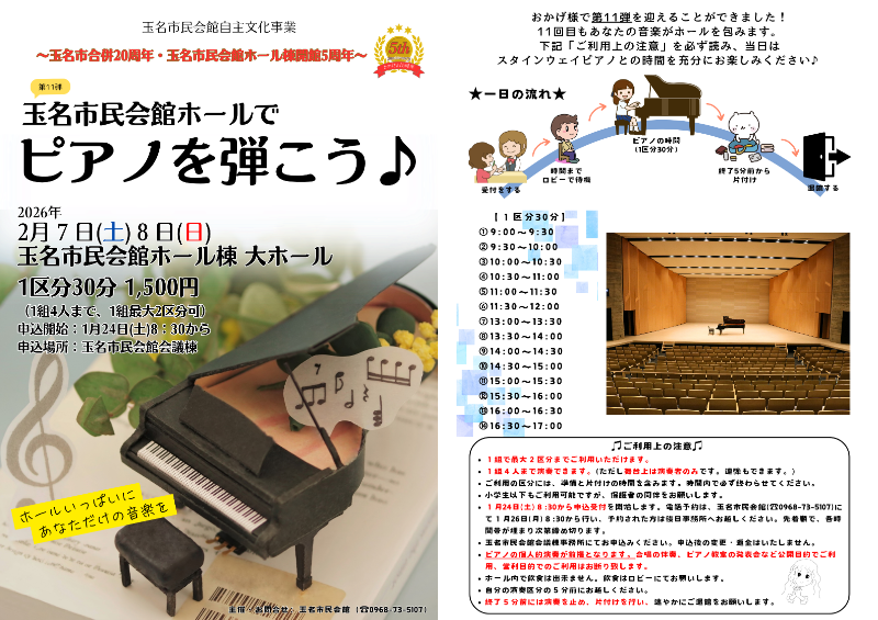 令和7年度の玉名市民会館の自主文化事業もこれでラスト!ホールでピアノを弾こう♪11回目の開催!2回以上参加された方も増えてきて嬉しい限りです!大ホールの舞台を独り占めしてみませんか?初めての参加も大歓迎!是非是非お申込みください!